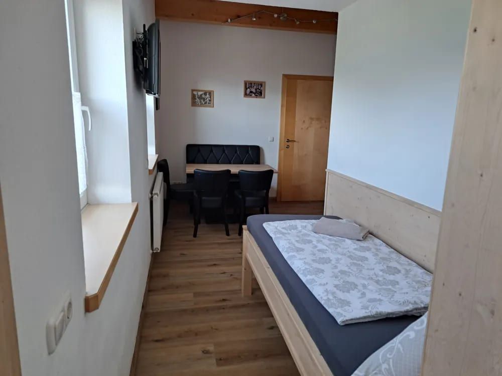 - Wohnraum mit Einzelbett und weiterem großzügigen Bad mit WC.